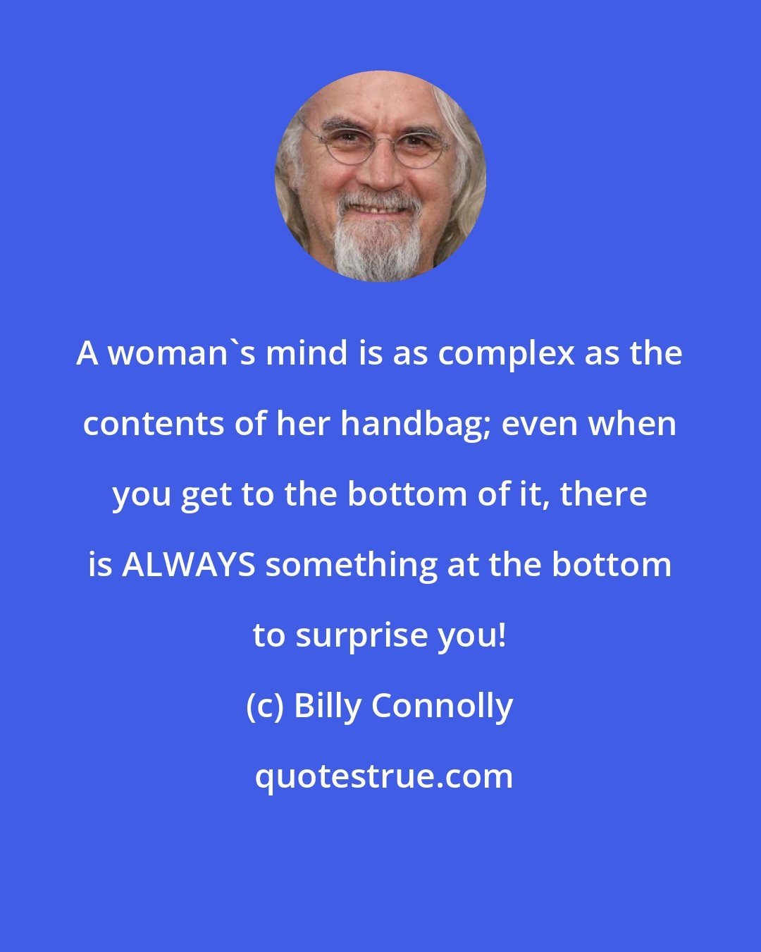 A woman's mind is as complex as the contents of her handbag; even when you get to the bottom of it, there is ALWAYS something at the bottom to surprise you!