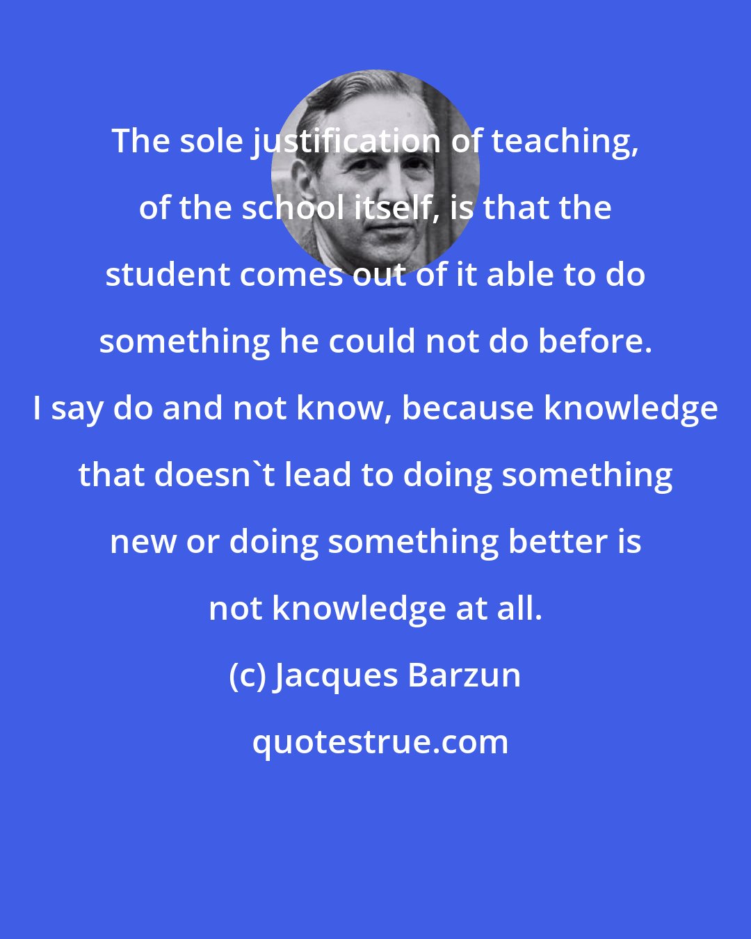The sole justification of teaching, of the school itself, is that the student comes out of it able to do something he could not do before. I say do and not know, because knowledge that doesn't lead to doing something new or doing something better is not knowledge at all.