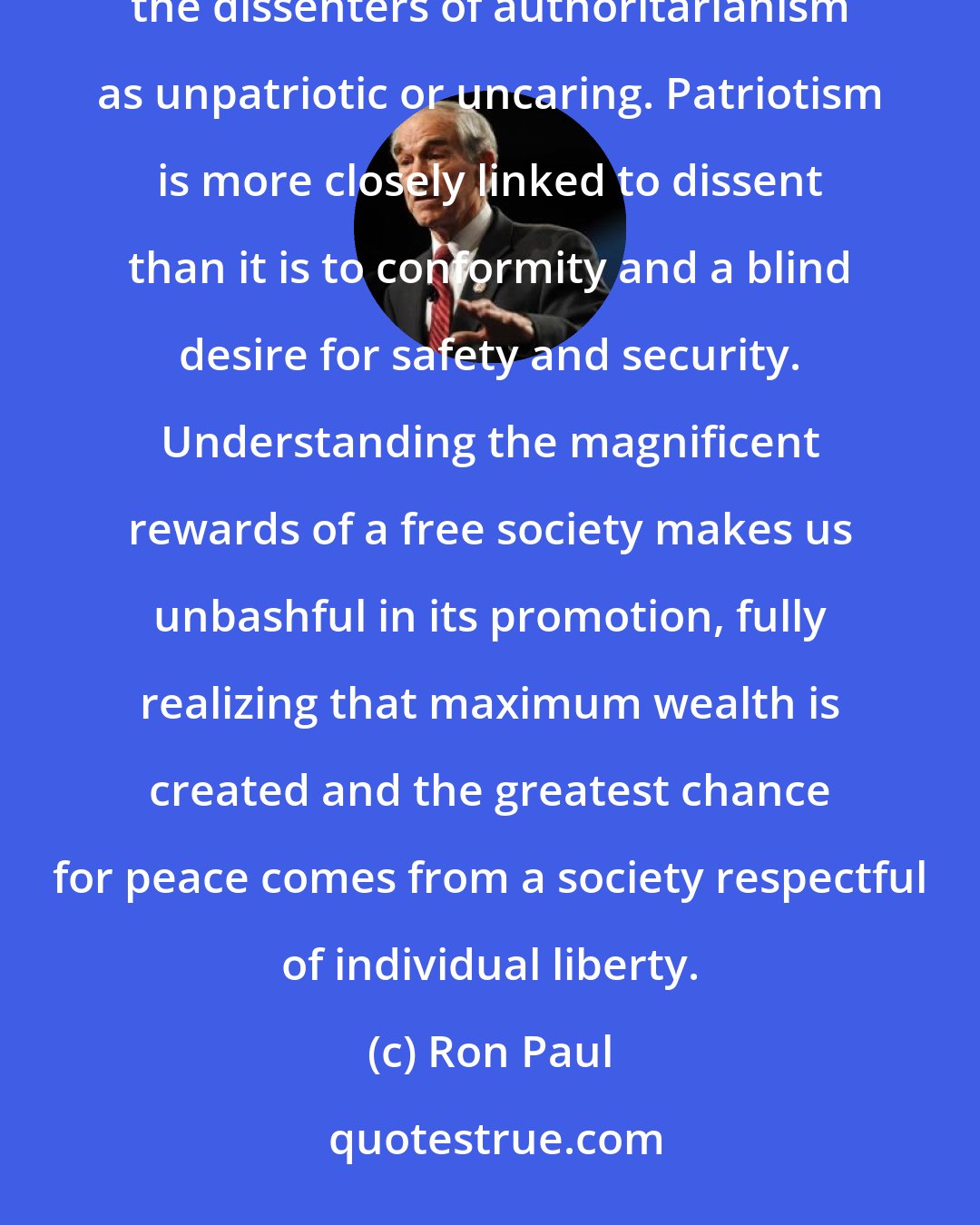 But let it not be said that we did nothing. Let not those who love the power of the welfare/warfare state label the dissenters of authoritarianism as unpatriotic or uncaring. Patriotism is more closely linked to dissent than it is to conformity and a blind desire for safety and security. Understanding the magnificent rewards of a free society makes us unbashful in its promotion, fully realizing that maximum wealth is created and the greatest chance for peace comes from a society respectful of individual liberty.
